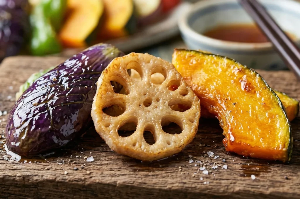 In our kitchen, we follow the tradition of the Japanese su-age technique. This involves deep fried methods without any batter or flour. By flash frying the fresh vegetables, we create a contrast that is entirely absent in a standard stew.