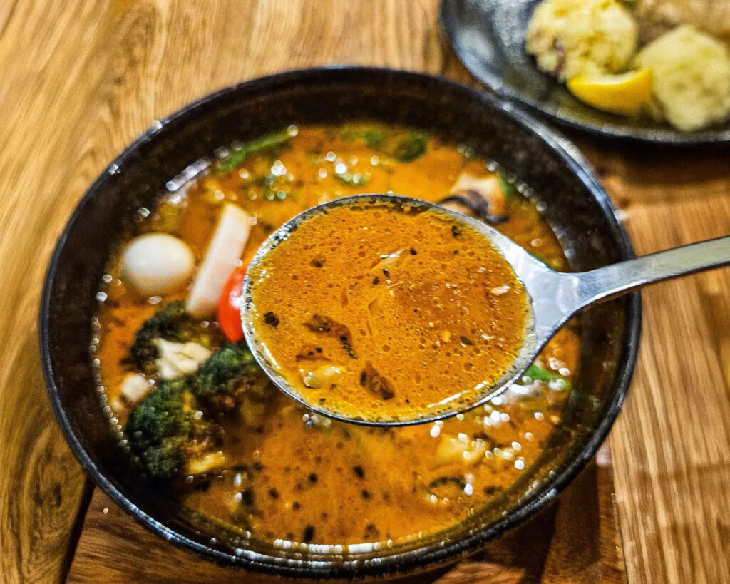 This style of eating highlights the difference between soup curry and typical Japanese curry. Unlike thick curry that coats the rice, soup curry invites interaction. It allows diners to control the balance of soup and rice with each bite, creating a personal rhythm at the table.