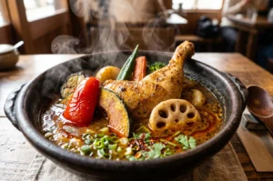 If there is one image that defines Hokkaido soup curry in the popular imagination, it is a single chicken leg, slow cooked until deeply tender, resting in a wide steaming bowl of fragrant, amber-coloured broth. This visual has become as iconic as the dish itself.