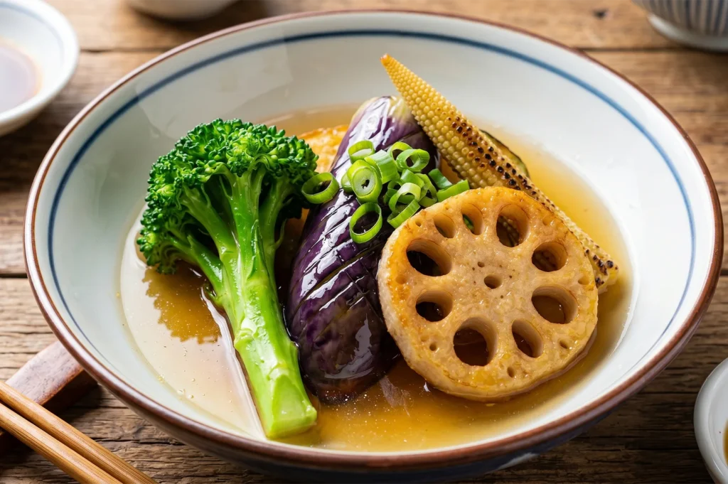 The Japanese su-age technique, a style of deep fried preparation using no batter, is applied to bell peppers, lotus root, okra, eggplant, potato, broccoli, baby corn, and carrot. This approach seals in colour, preserves texture, and concentrates the natural flavour of each ingredient.