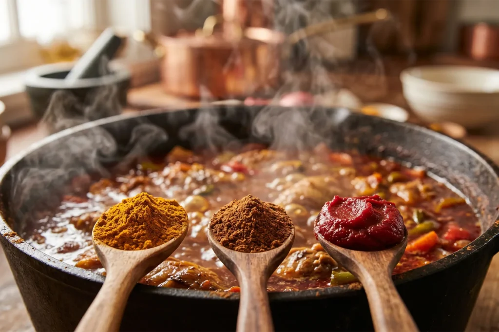 The soup base itself begins with chicken bones and pork bones, simmered low and slow in a heavy bottomed pot to extract every bit of collagen and flavour. Into this stock goes the spice foundation: curry powder, garam masala, tomato paste, and other spices layered in sequence. The onions are caramelised separately before being incorporated, providing the natural sweetness that balances the heat. This is not a process that can be rushed.