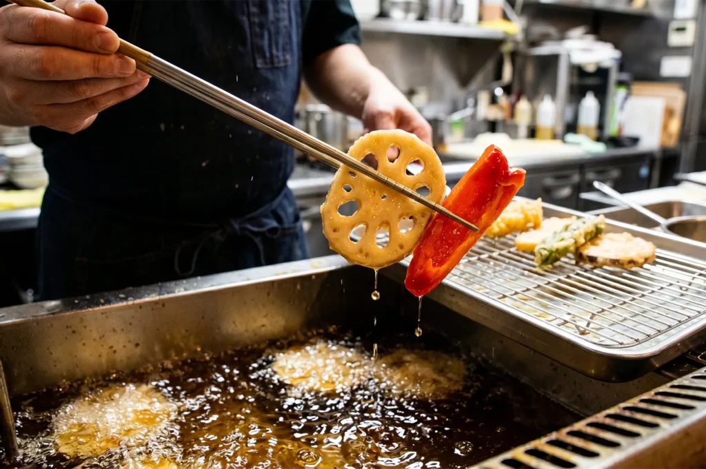 The deep fried vegetables we work with include bell peppers, lotus root, eggplant, carrots, potato, okra, and pumpkin. Each is cut using traditional Japanese methods: bell peppers halved lengthwise, lotus root sliced to reveal its beautiful cross-section, eggplant prepared so that it becomes silky in the soup without losing its form. The result is a bowl where the vegetables are vibrant, nicely browned in places, and visually stunning.